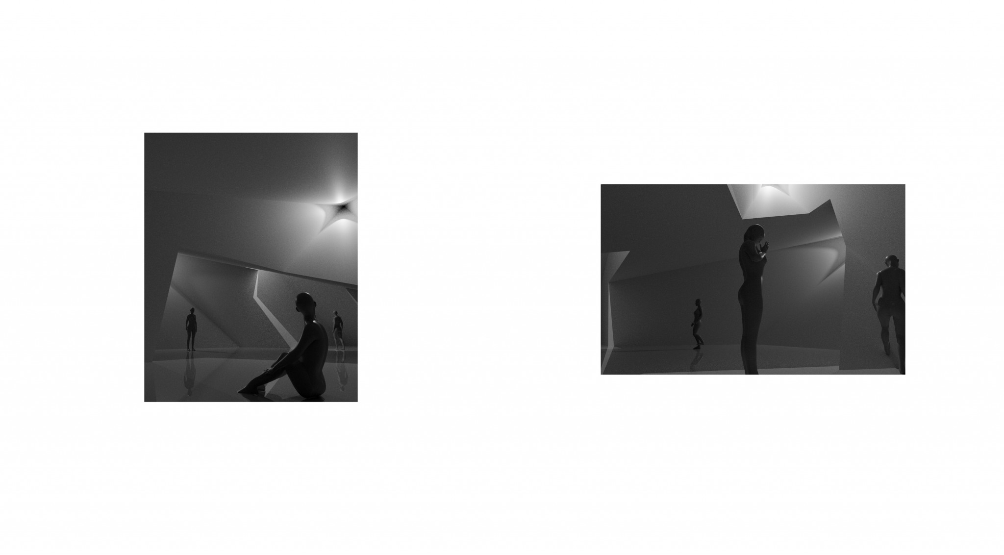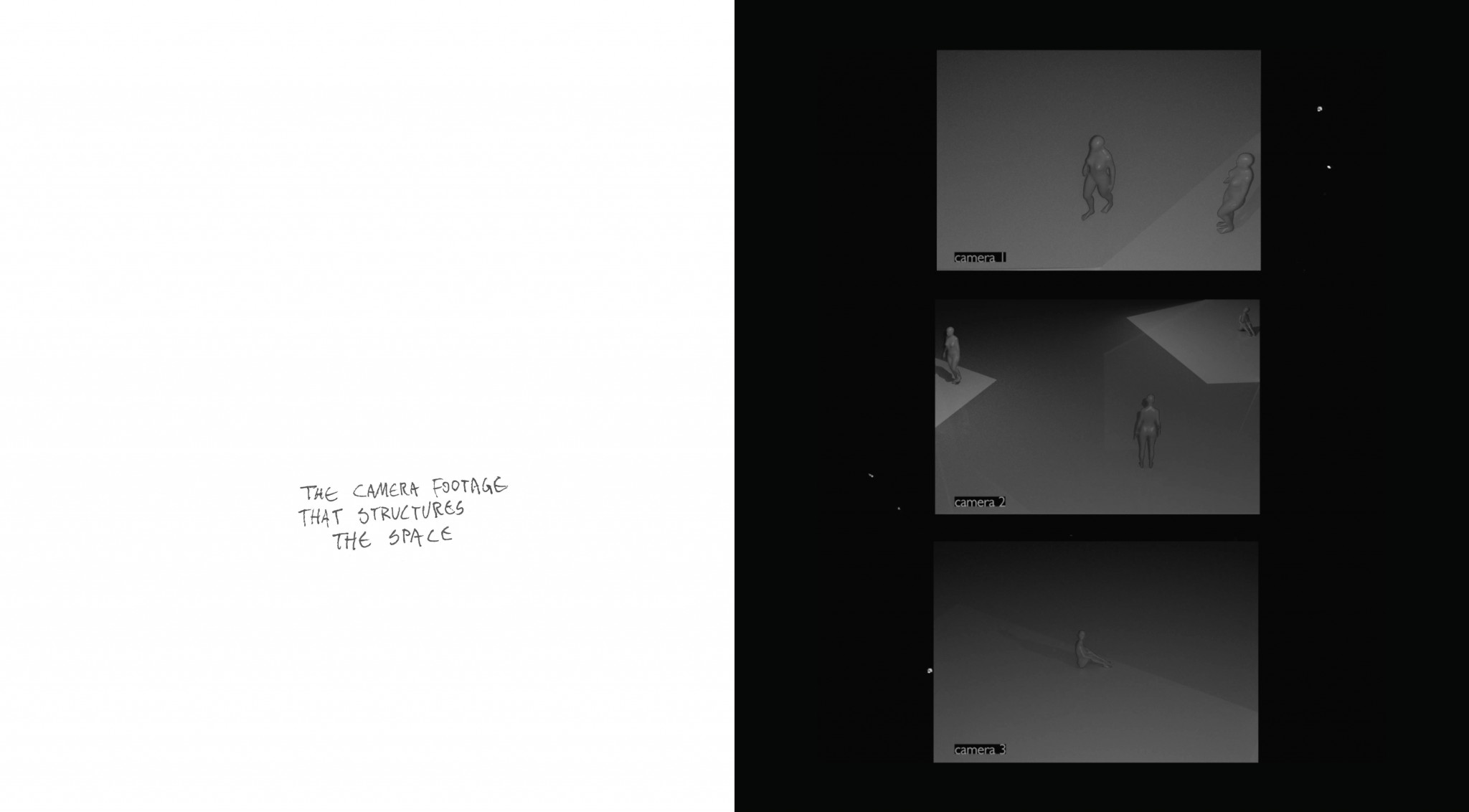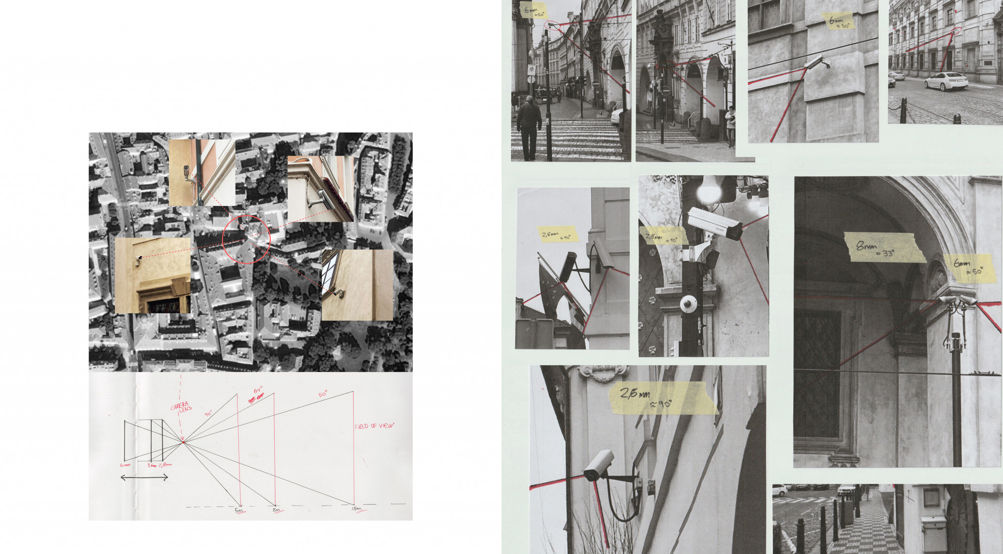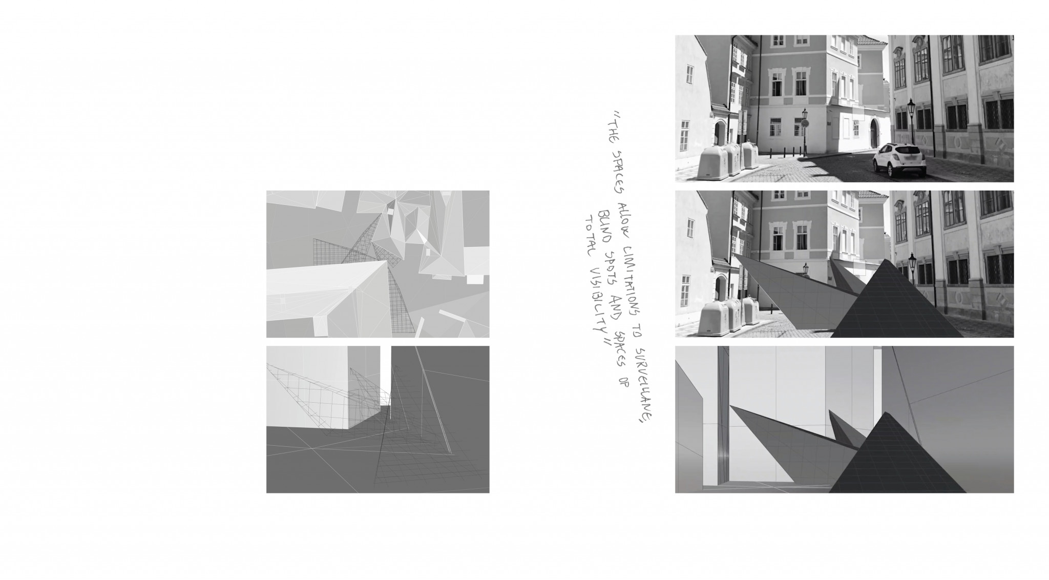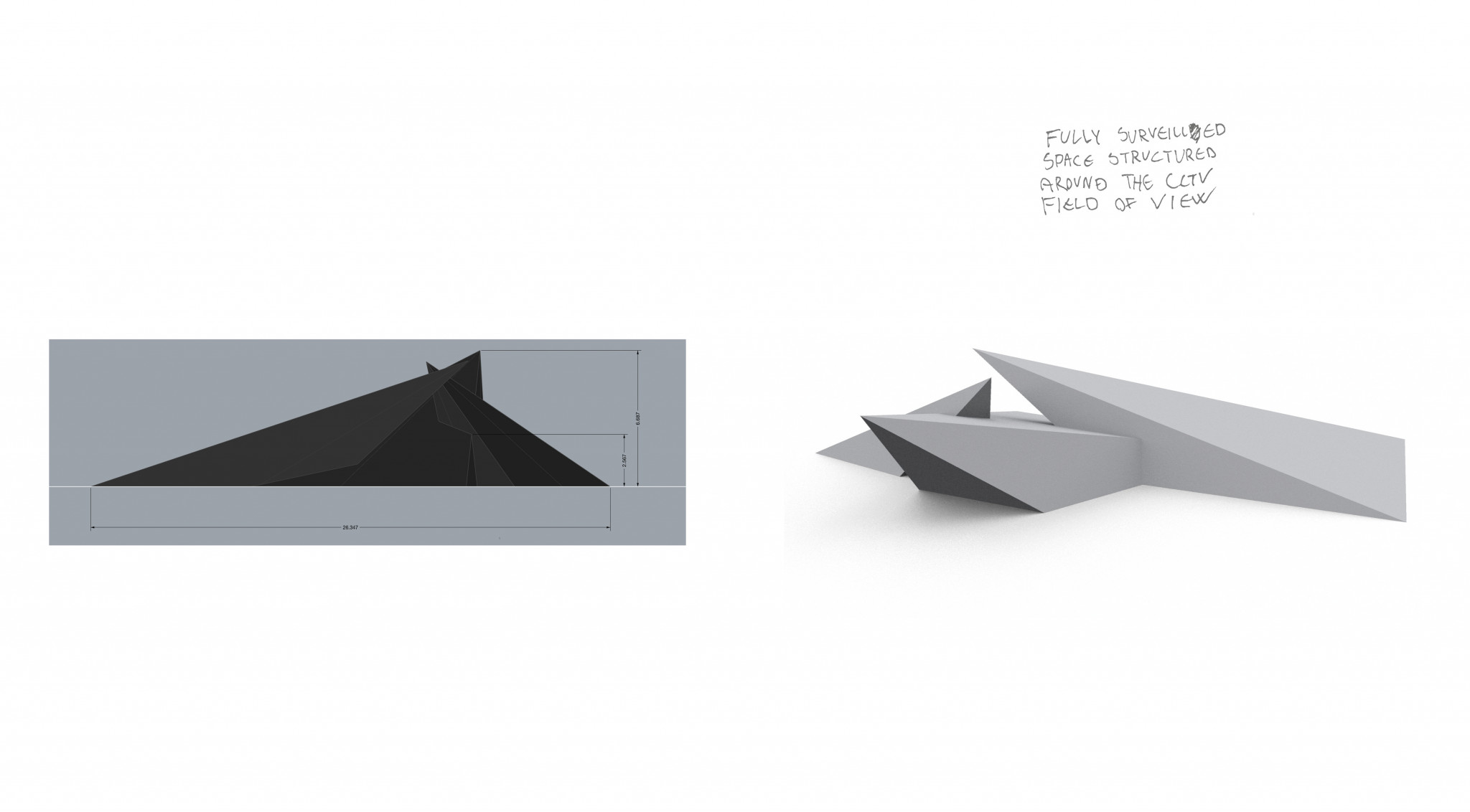 On the other hand, each “pyramid” has a camera in the corner, so the pyramid shaped angles from the camera are perfectly structured around the field of view of the CCTV. That makes the inside space fully surveilled and highlights the issue of being watched.